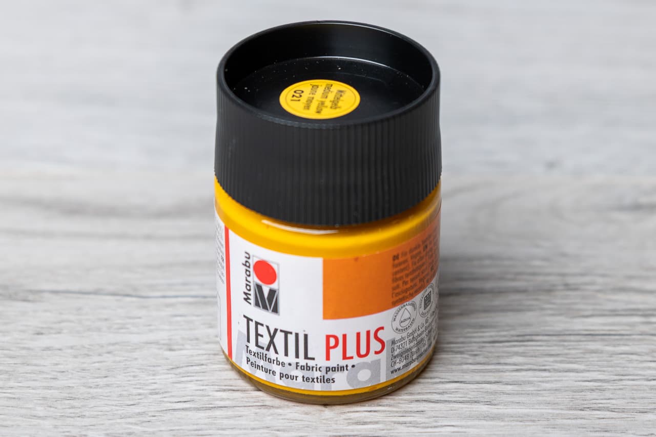 Start your fabric stenciling project with Marabu Textil Plus. This high-quality, water-based fabric paint delivers intense, opaque colors directly onto your textiles. It’s ideal for cotton and blended fabrics with up to 20 % synthetic fibers – perfect for pillow covers, baby onesies, bags, or shirts.