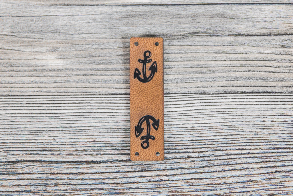 "Anchor" sew-on label with two applied hearts facing opposite directions, with a wonderful hand-lettered design. 15 mm x 54 mm made from high-quality artificial leather and free from hazardous substances (and also vegan). This clothing label is particular suitable for wrapping on an edge, for example, on a knitted or sewn scarf. Thanks to the two pre-punched holes on each side, this label can quickly be secured by hand with just a few stitches and can also be machine-washed.