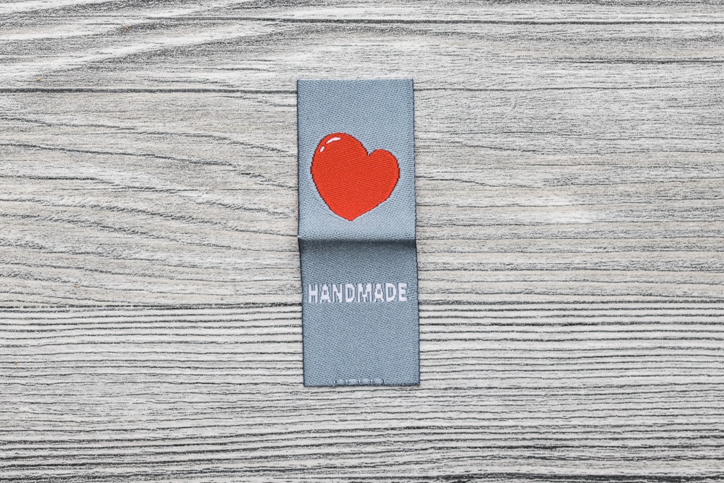 High quality textile label with center fold, made from polyester thread, for use as sew-on label for handmade items. "flag" for handmade items.
